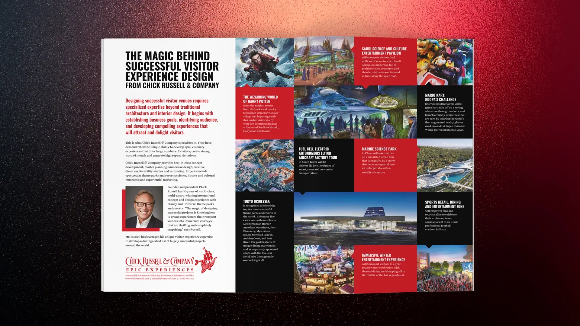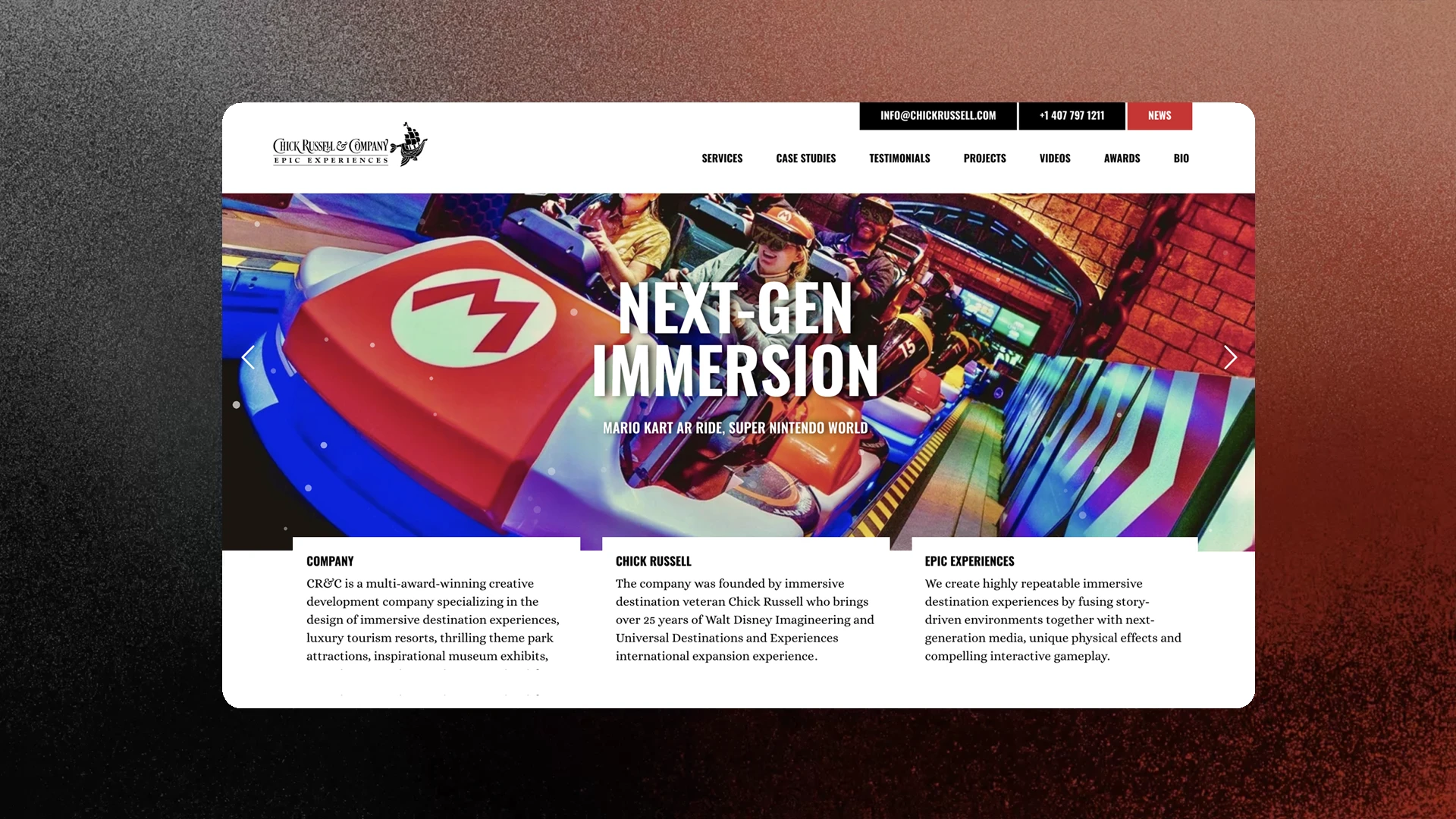 Chick Russell & Company needed to modernize their brand to reflect 25+ years of designing iconic attractions for Disney and Universal, including "Harry Potter" and "Transformers." I led a complete brand transformation—logo, style guide, marketing collateral, and a fully responsive ADA/WCAG-compliant website—to showcase their expertise to global markets and attract new international clients.